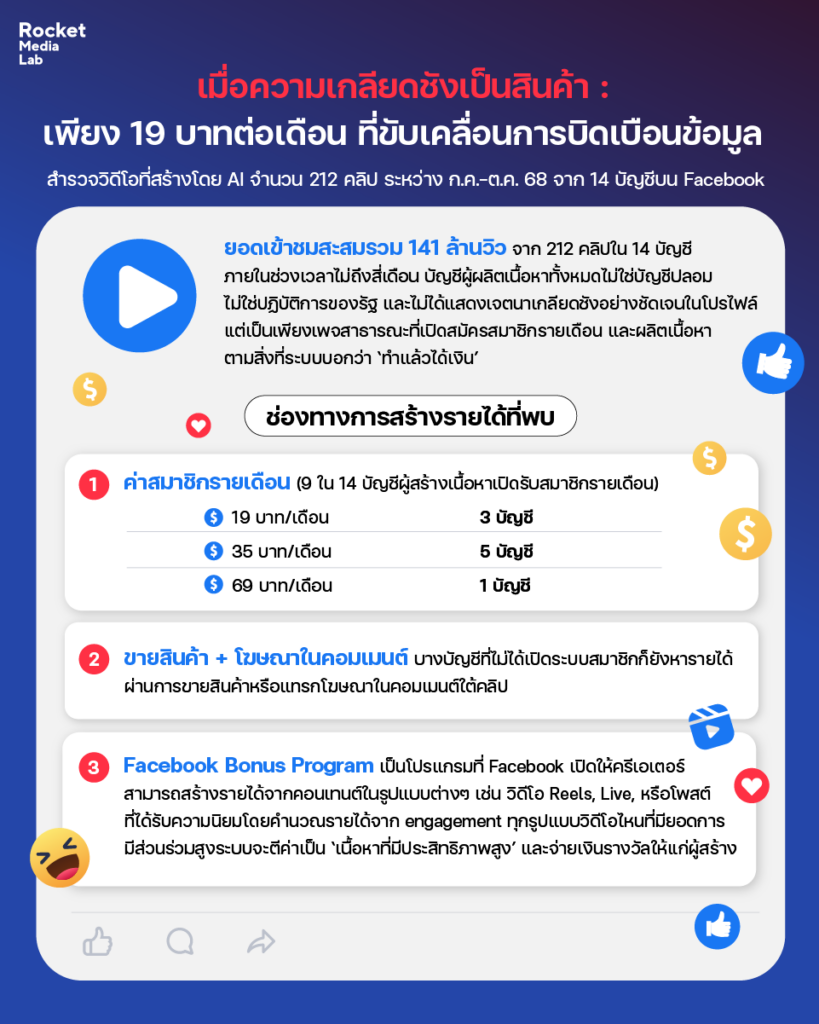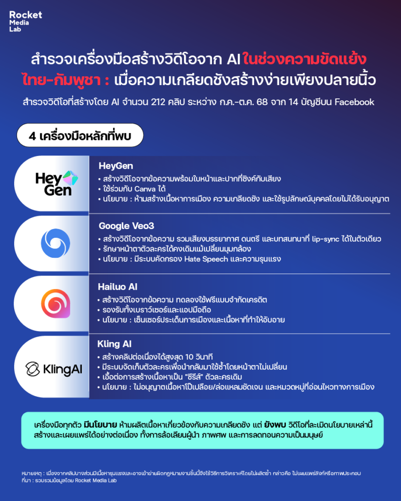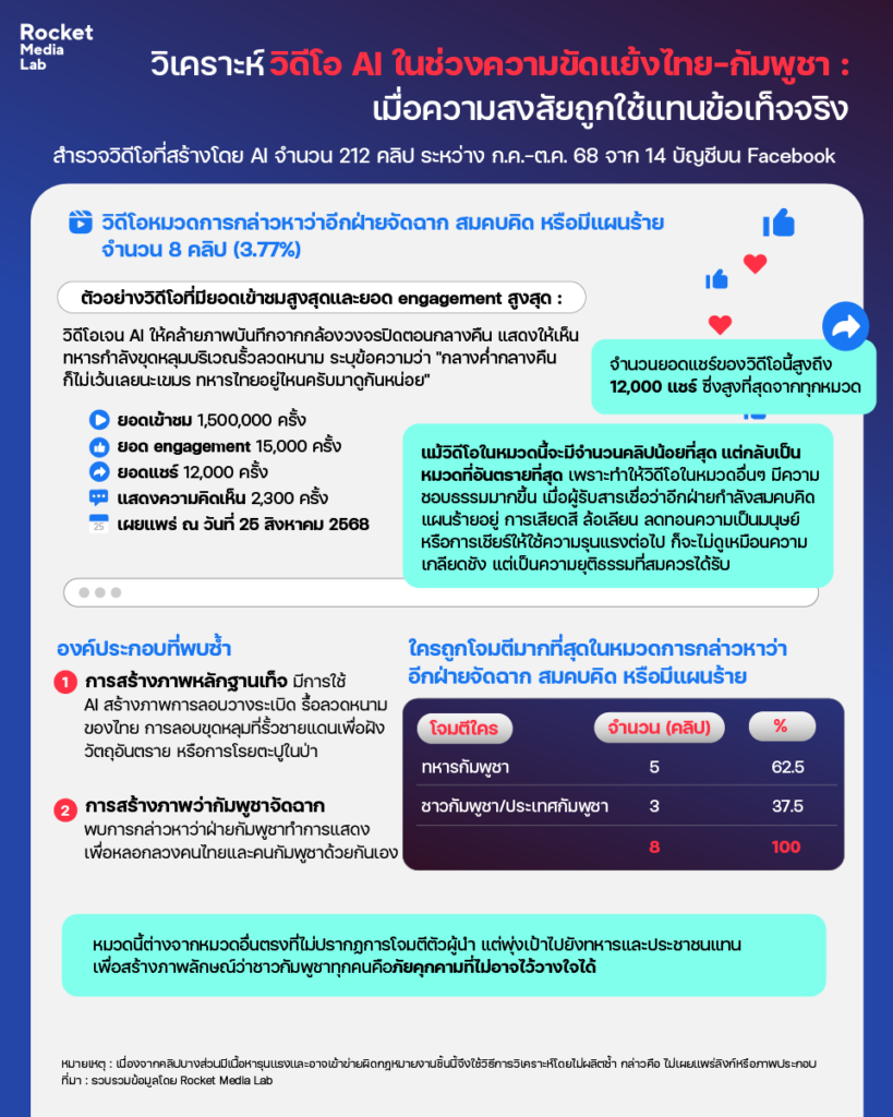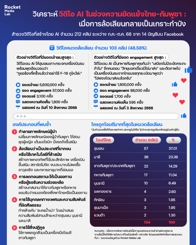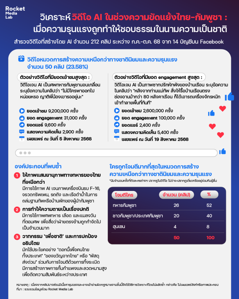 Rocket Media Lab รวบรวมวิดีโอที่เข้าข่ายการบิดเบือนข้อเท็จจริง (Disinformation) ที่สร้างโดย AI และมีเนื้อหาเกี่ยวข้องกับการสร้างความเกลียดชังในบริบทความขัดแย้งชายแดนไทยและกัมพูชา จำนวน 212 คลิป จาก 14 บัญชีผู้ใช้บน Facebook โดยในจำนวนนี้มี 9 บัญชีที่เปิดหารายได้โดยให้สมัครสมาชิกรายเดือนได้ มีราคาเริ่มต้นตั้งแต่ 19 บาทไปจนถึง 69 บาทต่อเดือน การเก็บข้อมูลครอบคลุมตั้งแต่ช่วงเริ่มเหตุปะทะในเดือนกรกฎาคม จนถึงการลงนามหยุดยิงในเดือนตุลาคม 2568 เพื่อวิเคราะห์ลักษณะของวิดีโอที่สร้างโดย AI ทั้งในแง่รูปแบบการสื่อสาร วิธีการสร้างความเกลียดชัง กลุ่มเป้าหมายที่ถูกโจมตี ตลอดจนบทบาทของเนื้อหาเหล่านี้ในการขยายความขัดแย้งในพื้นที่ออนไลน์