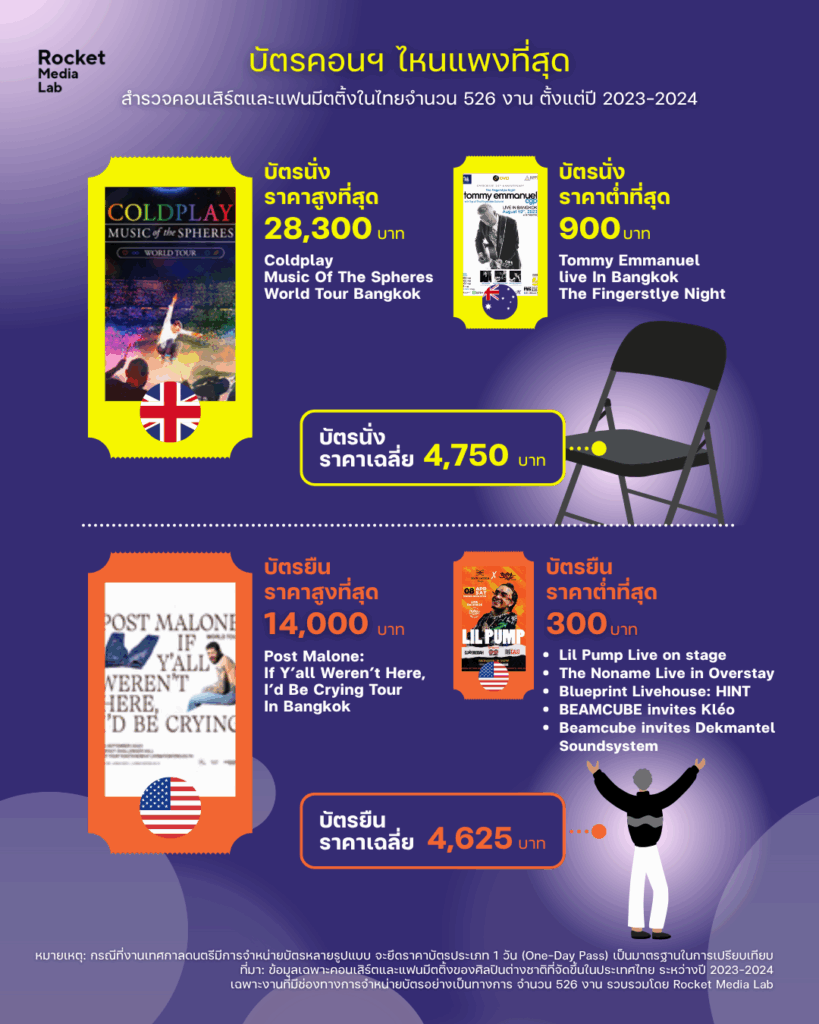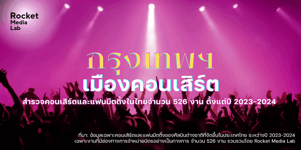 Rocket Media Lab ชวนสำรวจการจัดคอนเสิร์ตในไทยว่าตลอดสองปีที่ผ่านมา (2023-2024) ประเทศไทยเป็นสถานที่สำหรับจัดคอนเสิร์ตและแฟนมีตติ้งบ่อยแค่ไหน ราคาบัตรคอนเสิร์ตแพงมากน้อยแค่ไหน ศิลปินกลุ่มใดที่มาจัดบ่อยที่สุด และตลาดคอนเสิร์ตนี้ กว้างใหญ่แค่ไหนกัน และมีปัจจัยอะไรบ้างที่เป็นทั้งอุปสรรคและความท้าทายที่จะทำให้กรุงเทพฯ เป็นเมืองคอนเสิร์ตได้อย่างแท้จริง