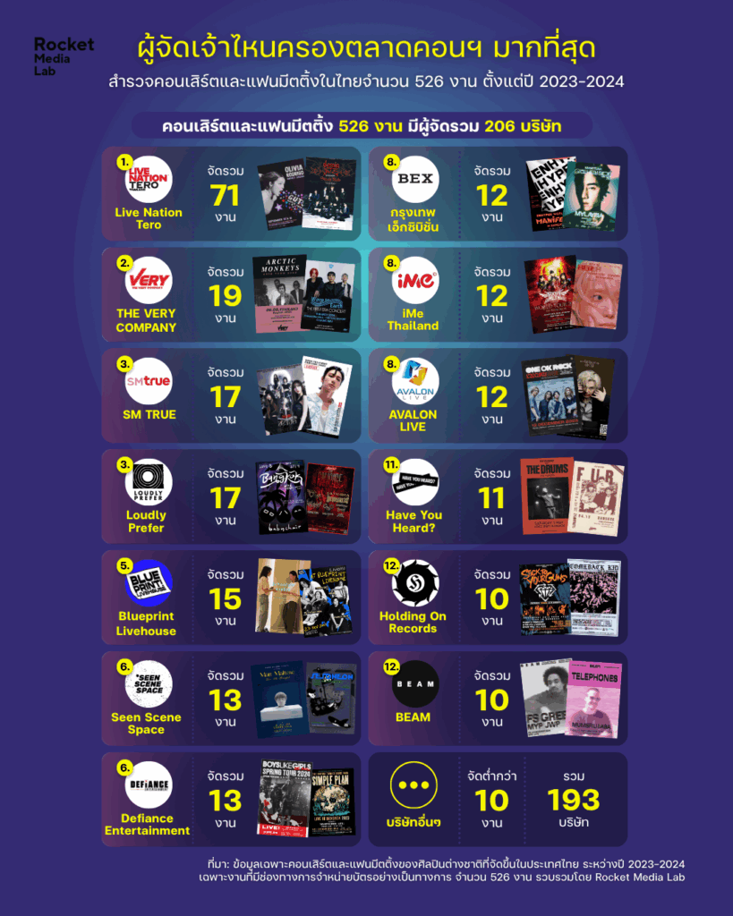 ตามมาด้วย Have You Heard? บริษัทที่เน้นจัดงานสายอินดี้ รวมถึงดนตรีทางเลือก จำนวน 11 งาน BEAM ซึ่งเน้นจัดงานในกลุ่มไลฟ์เฮาส์จำนวน 10 งาน Witchhunter Production Thailand 9 งาน และ Slamman Booking Asia 8 งาน ที่เน้นจัดงานสายร็อกและเมทัล เป็นต้น