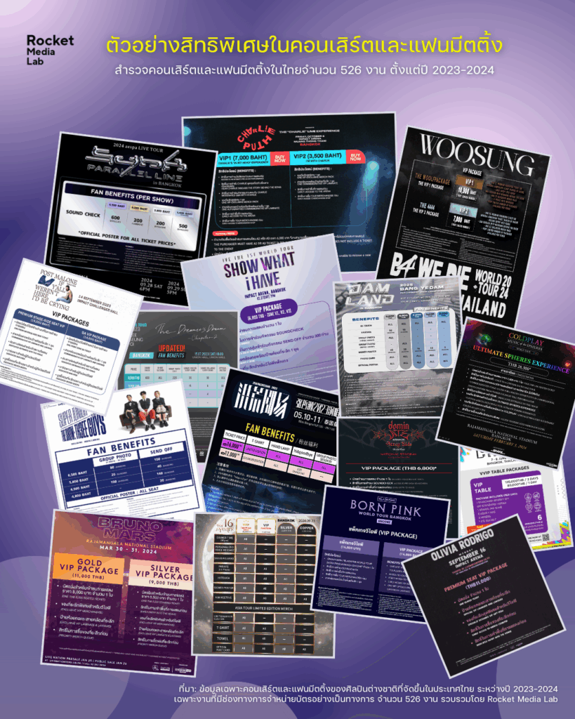 จากการสำรวจ งานที่ขายบัตรราคา 6,500 บาทขึ้นไป จำนวน 130 งาน ในปี 2023-2024 พบว่ามีเพียง 17 งานเท่านั้นที่ขายบัตรโดยไม่มีสิทธิพิเศษใดๆ เช่น คอนเสิร์ต JJ LIN (บัตรสูงสุด ราคา 11,000 บาท) Jay Chou (บัตรสูงสุด ราคา 9,988 บาท) Westlife (บัตรสูงสุด ราคา 6,500 บาท) The 1975 (บัตรสูงสุด ราคา 6,500 บาท) ขณะที่อีก 113 งาน หรือคิดเป็น 86.9% ของกลุ่มบัตรราคาสูง เลือกใช้กลยุทธ์การขายแพ็กเกจที่พ่วงสิทธิพิเศษมาด้วย