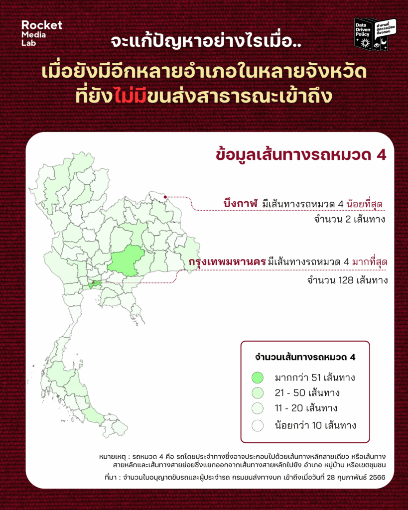 แม้จำนวนเส้นทางรถหมวด 4 จะมีมาก แต่พบว่ายังมีอีกหลายอำเภอที่ยังไม่มีเส้นทางรถหมวด 4 เช่น เชียงใหม่ มีเส้นทางรถหมวด 4 จำนวน 28 เส้นทาง แต่มี 9 อำเภอจาก 25 อำเภอที่เข้าไม่ถึงเส้นทางรถหมวด 4 หรือจังหวัดหนองคาย มีเส้นทางรถหมวด 4 จำนวน 6 เส้นทาง แต่มี 4 จาก 9 อำเภอที่เข้าไม่ถึงเส้นทางรถหมวด 4 สะท้อนถึงความครอบคลุมของเส้นทางรถประจำทางระหว่างอำเภอที่ยังเข้าไม่ถึง