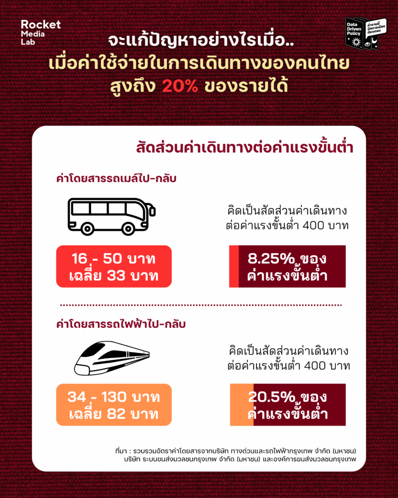 หากเทียบกับค่าแรงขั้นต่ำ 400 บาทต่อวัน พบว่า หากเดินทางด้วยรถเมล์ 16-50 บาท เฉลี่ยค่าโดยสาร 33 บาทต่อวัน คิดเป็นค่าใช้จ่ายในการเดินทาง 8.25% ของค่าแรงขั้นต่ำ ในขณะที่เดินทางด้วยรถไฟฟ้า 34-130 บาท เฉลี่ยค่าโดยสาร 82 บาทต่อวัน คิดเป็นค่าใช้จ่ายในการเดินทาง 20.5% ของค่าแรงขั้นต่ำ
