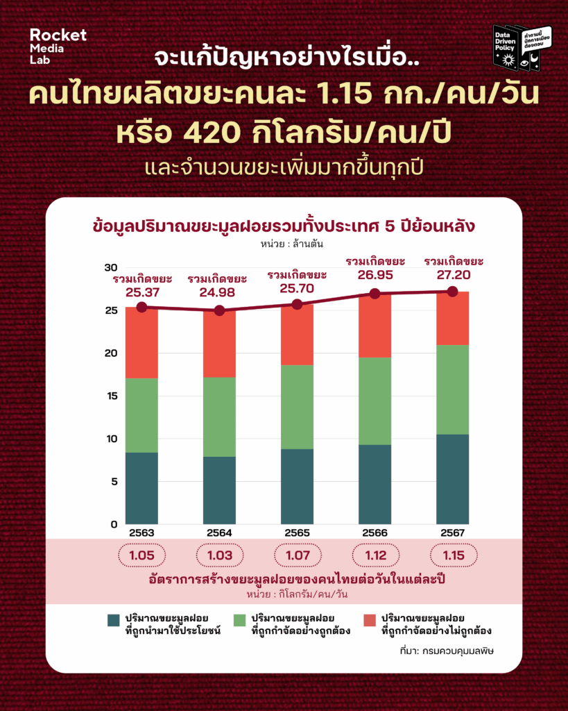 จะแก้ปัญหาอย่างไร เมื่อคนไทยผลิตขยะคนละ 1.15 กก./คน/วัน หรือ 420 กิโลกรัม/คน/ปี และจำนวนขยะเพิ่มมากขึ้นทุกปี