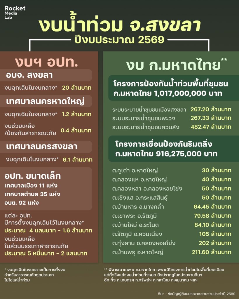 จากสถานการณ์น้ำท่วมหาดใหญ่ จ.สงขลา ในขณะนี้ Rocket Media Lab ชวนสำรวจการใช้งบน้ำท่วมของ จ.สงขลา จากปีงบประมาณ 2569 ว่าทั้งในส่วนของ อปท. ที่เกี่ยวข้องกับความช่วยเหลือ/ป้องกันสาธารณภัย รวมไปถึงงบฉุกเฉินในกรณีที่มีเหตุสาธารณภัยเกิดขึ้น และงบป้องกันน้ำท่วมจากกระทรวง โดยเฉพาะกระทรวงมหาดไทยที่มีโครงการป้องกันน้ำท่วมในพื้นที่เขตเมือง มีงบประมาณเท่าไหร่ มีโครงการอะไรในพื้นที่ไหนบ้าง และการตั้งงบประมาณและโครงการการใช้งบประมาณน้ำท่วมนี้ สะท้อนให้เห็นถึงเรื่องอะไร เมื่อพิจารณาจากสถานการณ์น้ำท่วมหาดใหญ่ จ.สงขลา ในครั้งนี้