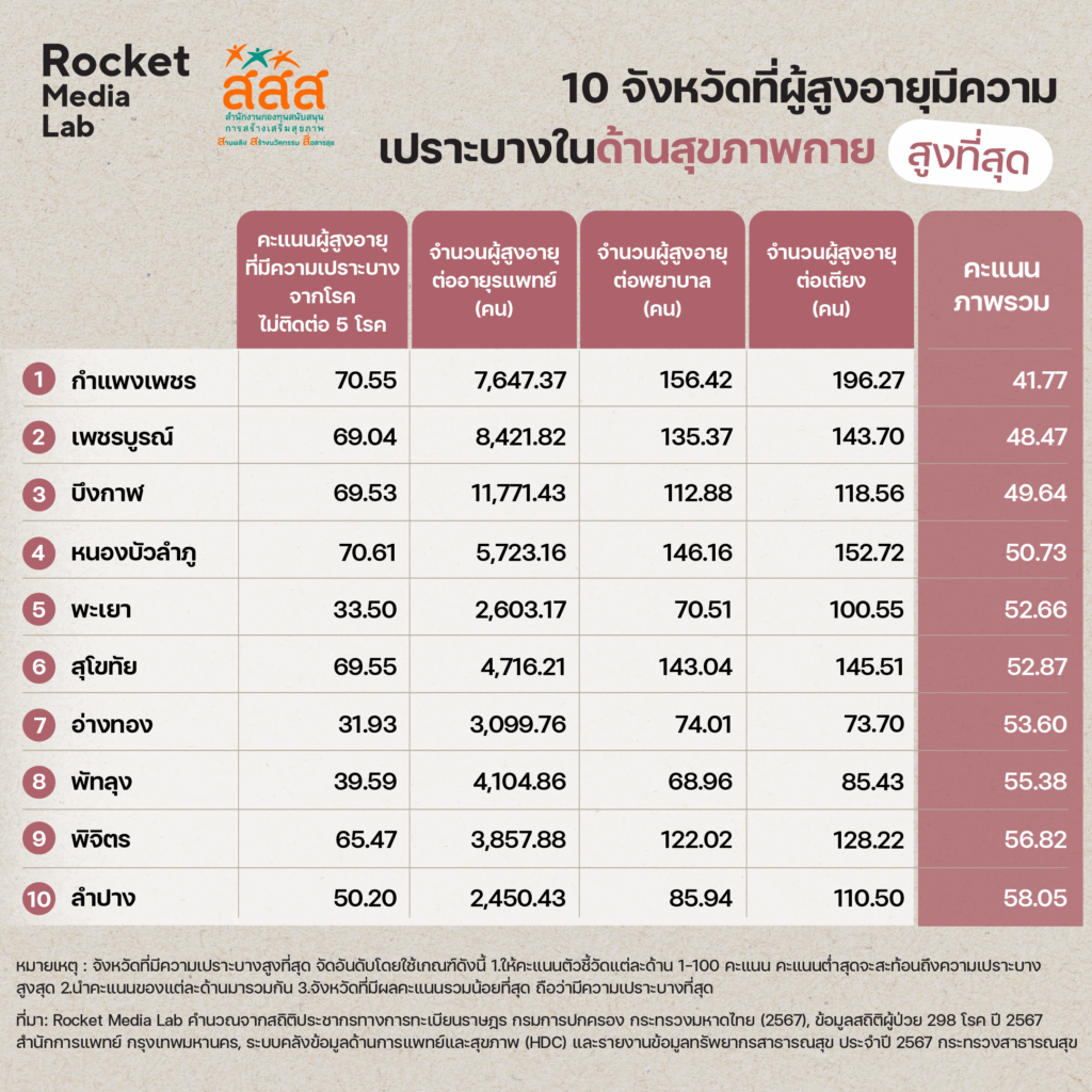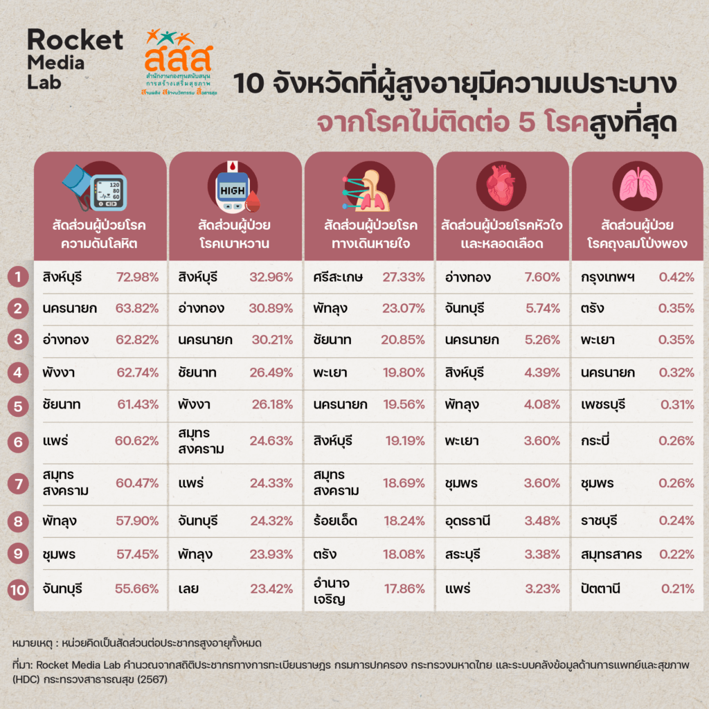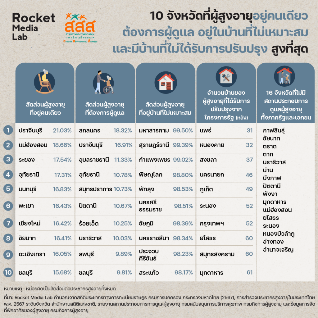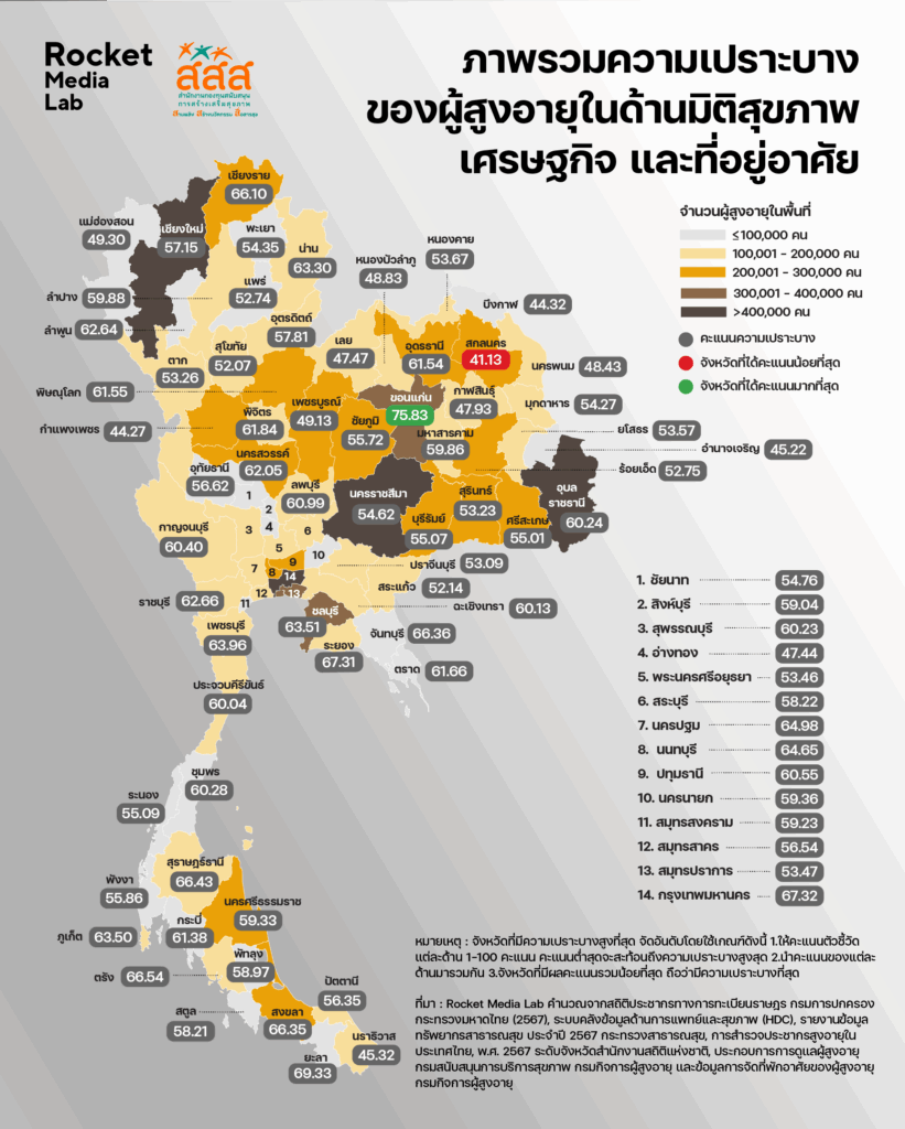 Rocket Media Lab ร่วมกับสำนักงานกองทุนสนับสนุนการสร้างเสริมสุขภาพ (สสส.) จัดทำข้อมูลการศึกษาพื้นที่เปราะบางต่อผู้สูงอายุ ทั้งในมิติด้านสุขภาพ เศรษฐกิจ และที่อยู่อาศัย เพื่อใช้ในการเฝ้าระวัง และวางแผนนโยบายในอนาคตเพื่อรับมือกับสังคมสูงวัยในแต่ละพื้นที่ของประเทศไทย