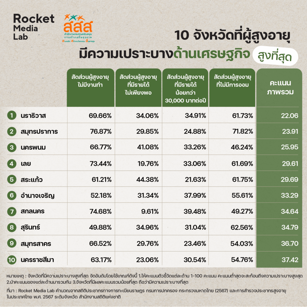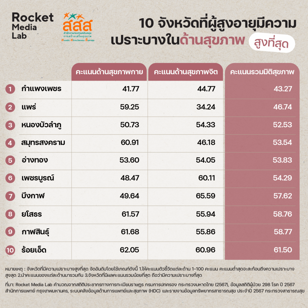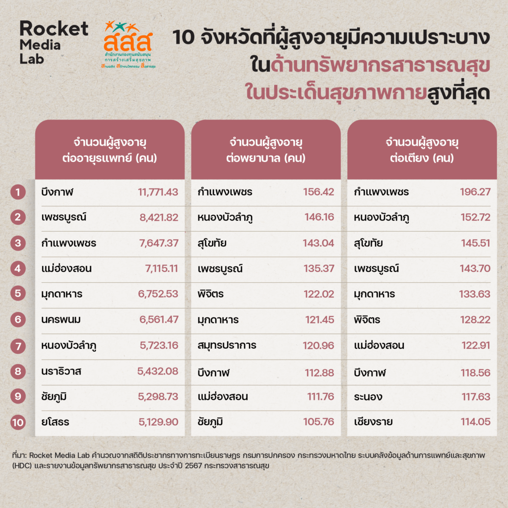 Rocket Media Lab ร่วมกับสำนักงานกองทุนสนับสนุนการสร้างเสริมสุขภาพ (สสส.) จัดทำข้อมูลการศึกษาพื้นที่เปราะบางต่อผู้สูงอายุ ทั้งในมิติด้านสุขภาพ เศรษฐกิจ และที่อยู่อาศัย เพื่อใช้ในการเฝ้าระวัง และวางแผนนโยบายในอนาคตเพื่อรับมือกับสังคมสูงวัยในแต่ละพื้นที่ของประเทศไทย