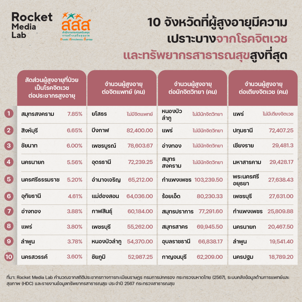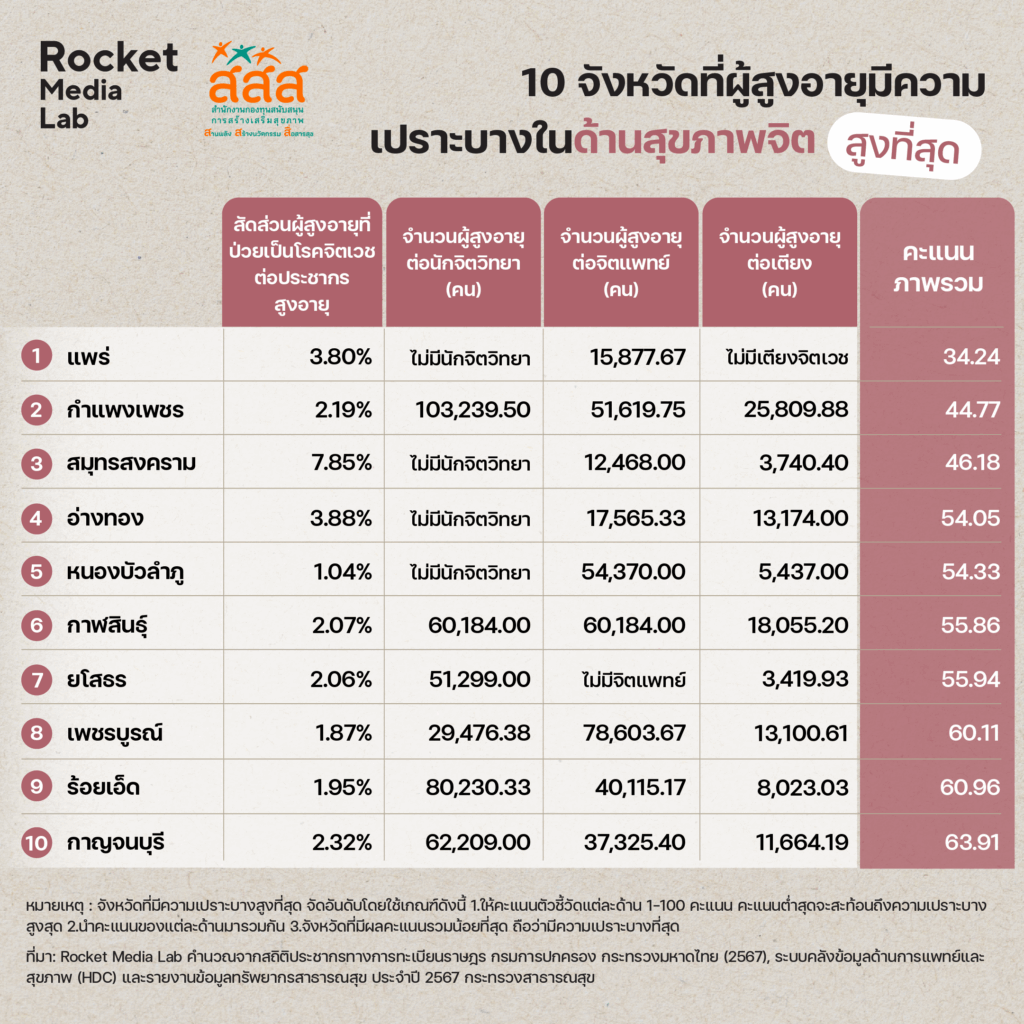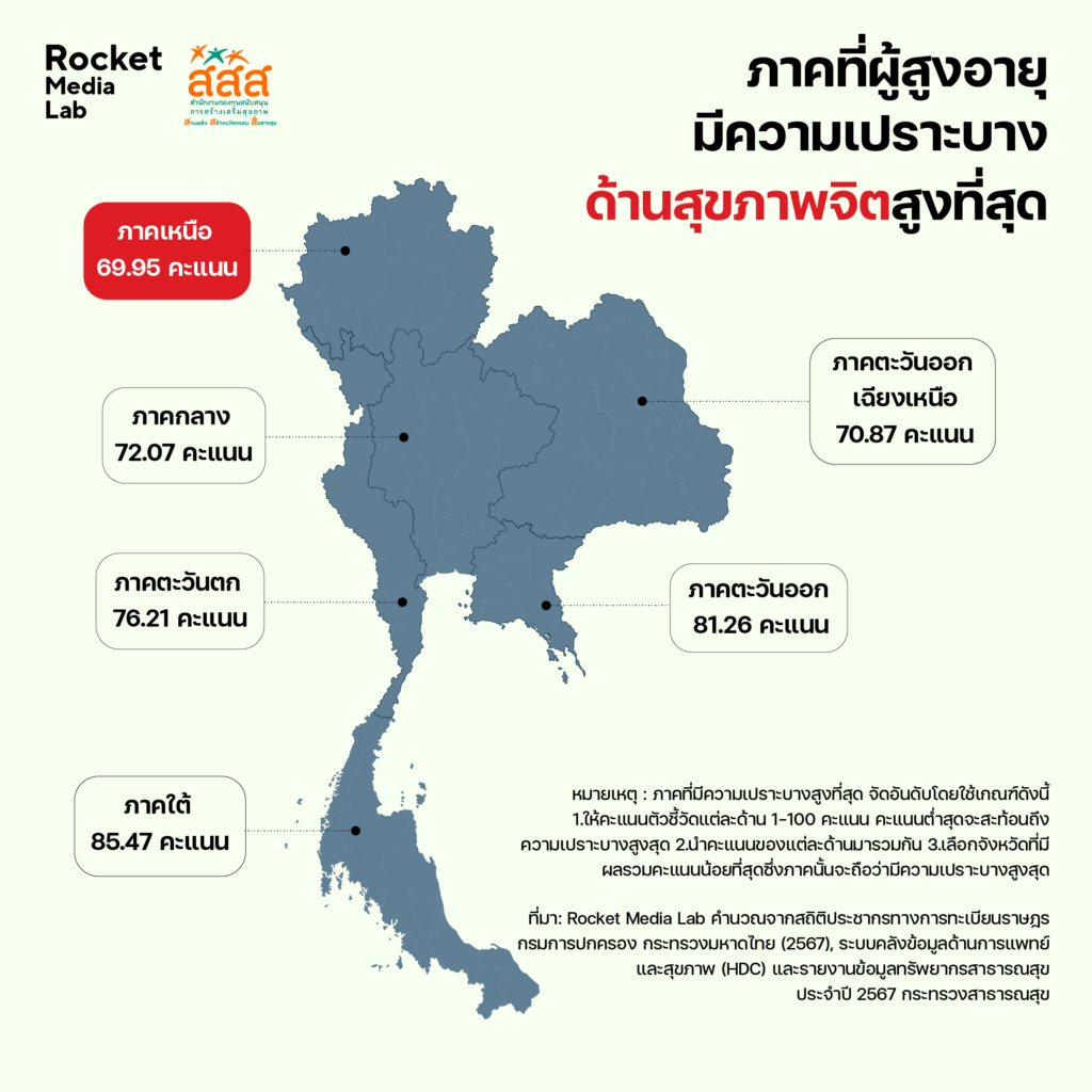 - ภาคที่ผู้สูงอายุมีความเปราะบางในด้านสุขภาพจิตสูงที่สุด คือ ภาคเหนือ โดยจังหวัดที่ผู้สูงอายุมีความเปราะบางในด้านสุขภาพจิตสูงที่สุด คือ แพร่