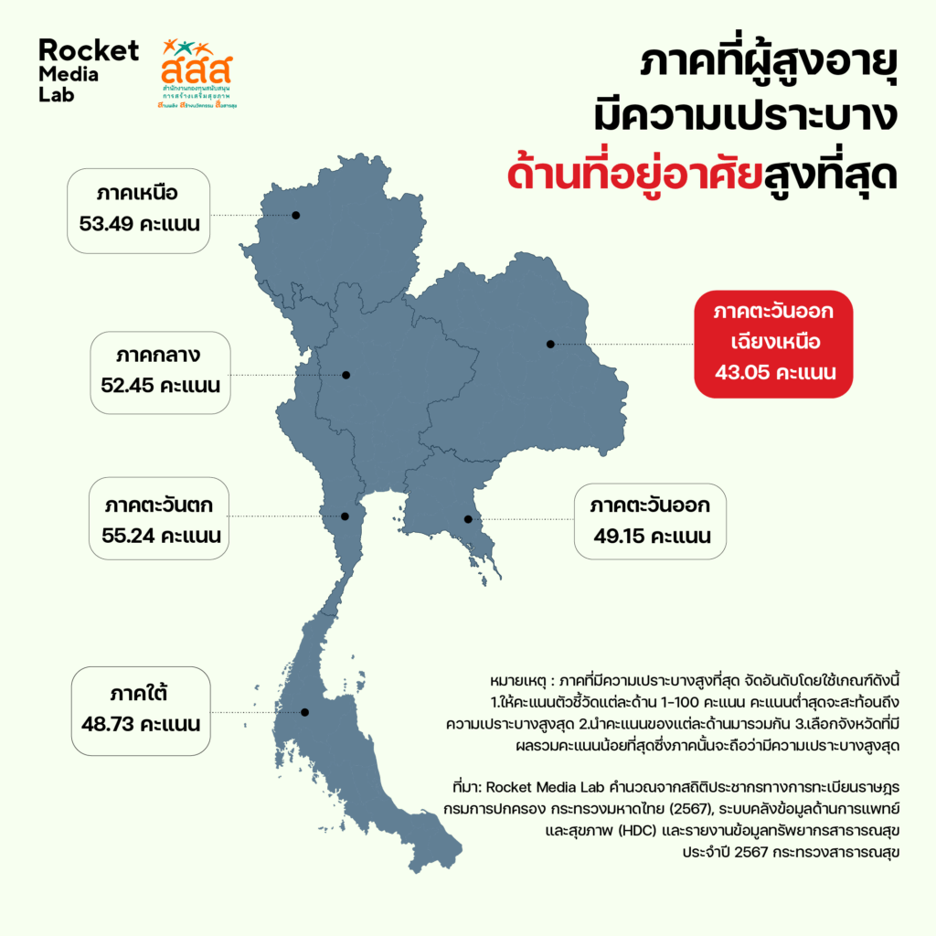 หากพิจารณาเป็นรายภาค พบว่าภาคที่ผู้สูงอายุมีความเปราะบางในด้านที่อยู่อาศัยสูงสุดคือ ภาคตะวันออกเฉียงเหนือ 43.05 คะแนน ตามด้วยภาคใต้ 48.73 คะแนน ภาคตะวันออก 49.15 คะแนน ภาคกลาง 52.45 คะแนน ภาคเหนือ 53.49 คะแนน และภาคตะวันตก 55.24 คะแนน