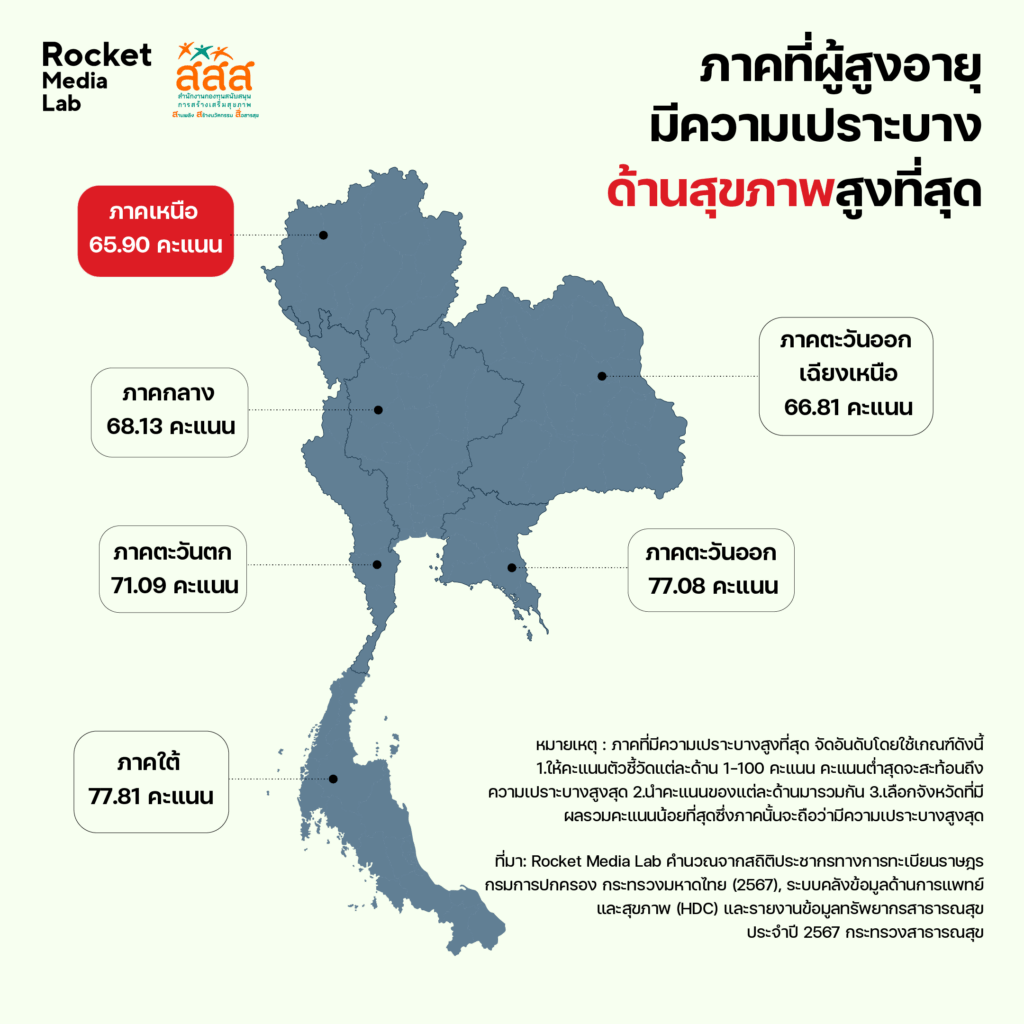 หากพิจารณาเป็นรายภาค พบว่าภาคที่ผู้สูงอายุมีความเปราะบางสูงสุดคือ ภาคตะวันออกเฉียงเหนือ 53.44 คะแนน ตามด้วยภาคกลาง 57.63 คะแนน ภาคเหนือ 58.14 คะแนน ภาคตะวันตก 60.07 คะแนน ภาคใต้ 60.21 คะแนน และภาคตะวันออก 60.72 คะแนน