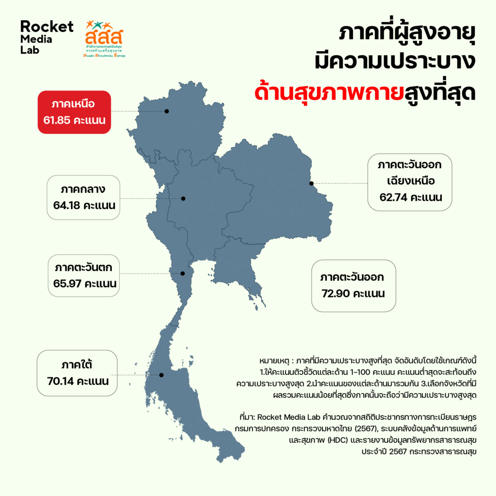 - ภาคเหนือเป็นภาคที่ผู้สูงอายุมีความเปราะบางในด้านสุขภาพกายสูงที่สุด โดยจังหวัดที่ผู้สูงอายุมีความเปราะบางในด้านสุขภาพกายสูงที่สุด คือ กำแพงเพชร