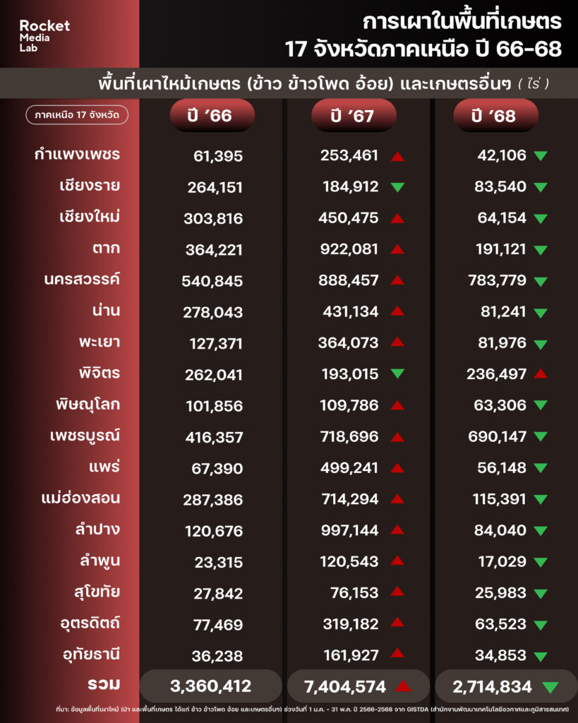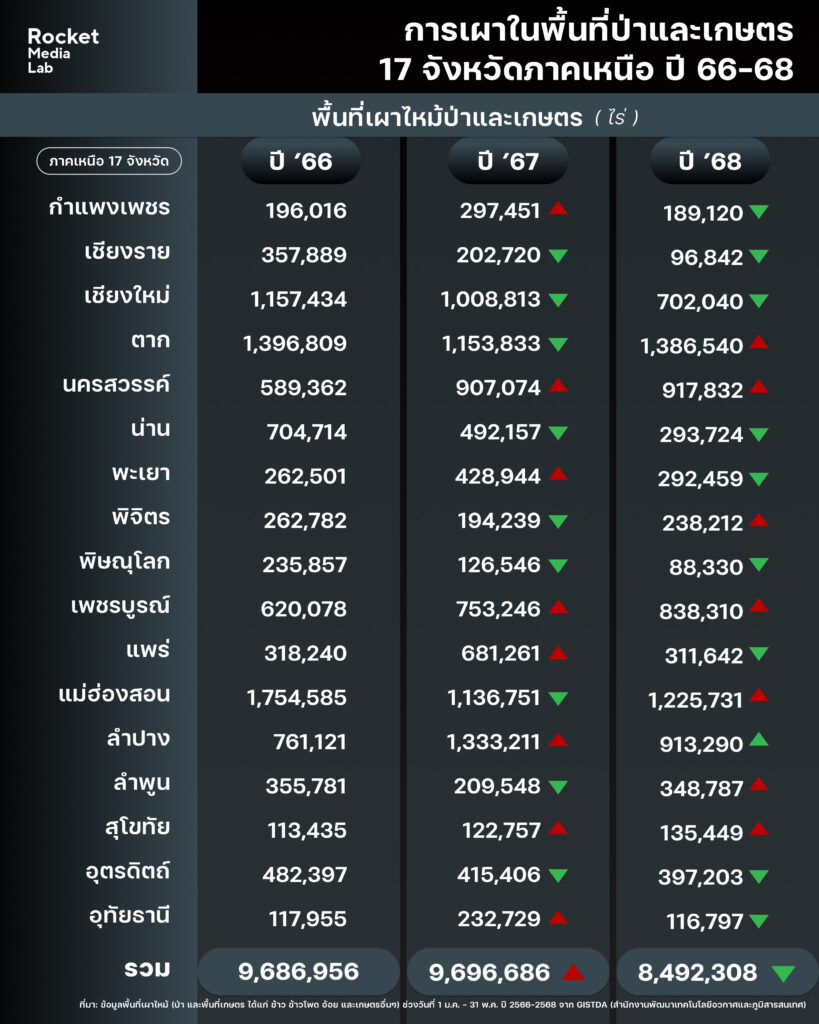 เมื่อพิจารณาภาพรวมของพื้นที่เผาไหม้ทั้งหมดใน 17 จังหวัดภาคเหนือ ซึ่งครอบคลุมทั้งพื้นที่ป่า และพื้นที่เกษตรกรรม ทั้งนาข้าว อ้อย ข้าวโพดและเกษตรกรรมอื่นๆ จาก GISTDA ระหว่างปี 2566-2568 พบว่า พื้นที่เผาไหม้รวมเพิ่มขึ้นจาก 9,686,956 ไร่ในปี 2566 เป็น 9,696,686 ในปี 2567 ก่อนจะลดลงเป็น 8,492,308 ไร่ ในปี 2568