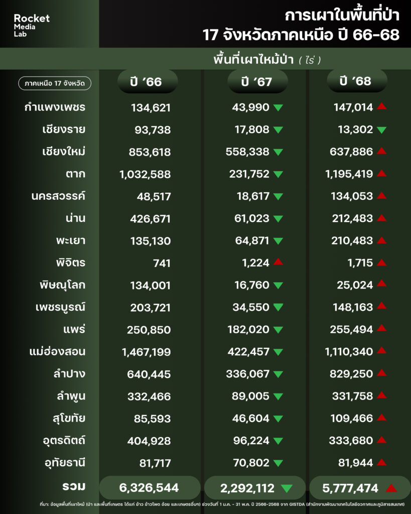 ตัวเลขพื้นที่เผาไหม้ในพื้นที่ป่า ใน 17 จังหวัดภาคเหนือ ตั้งแต่ปี 2566-2568 จาก GISTDA ในภาพรวมพบว่าในปี 2566 มีพื้นที่เผาไหม้รวมกันสูงถึง 6,326,544 ไร่ ก่อนจะลดลงในปี 2567 มาอยู่ที่ 2,292,112 ไร่ และกลับมาเพิ่มขึ้นอีกครั้งในปี 2568 ที่ 5,777,474 ไร่ ซึ่งเป็นการเพิ่มขึ้นถึง 3,485,362 ไร่