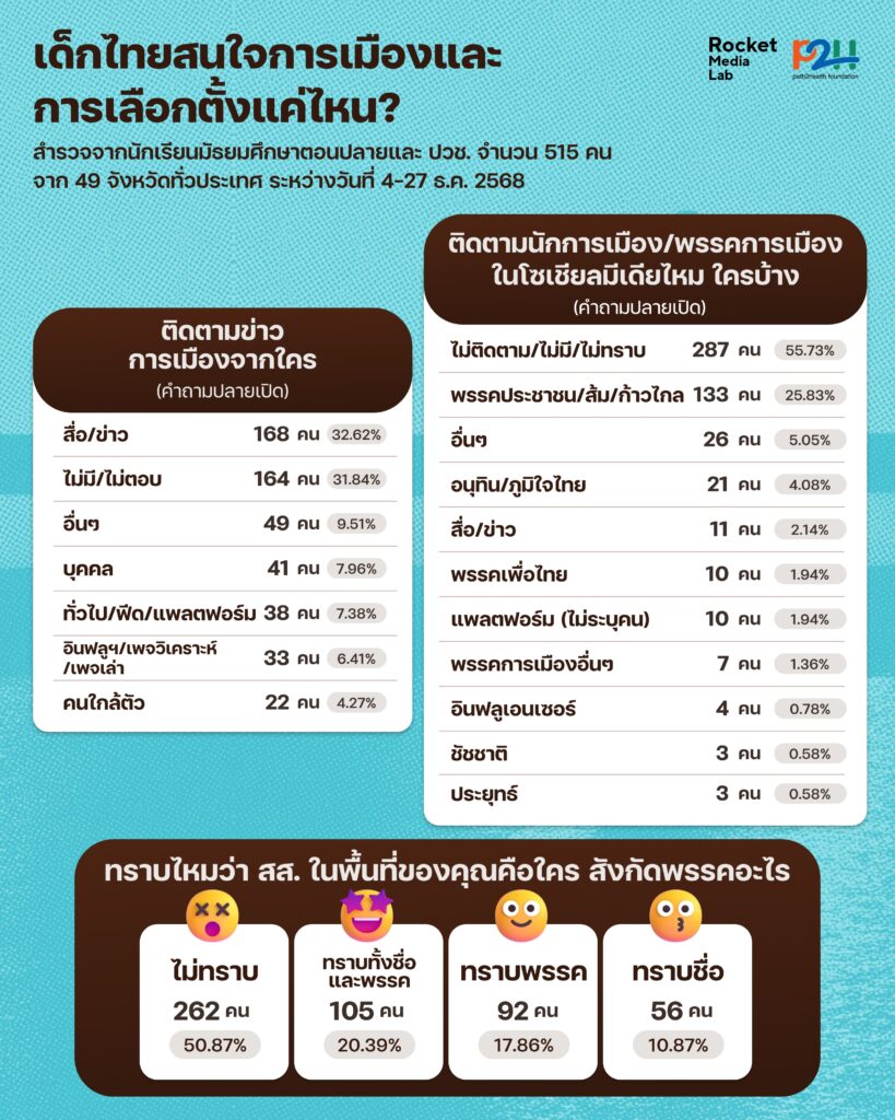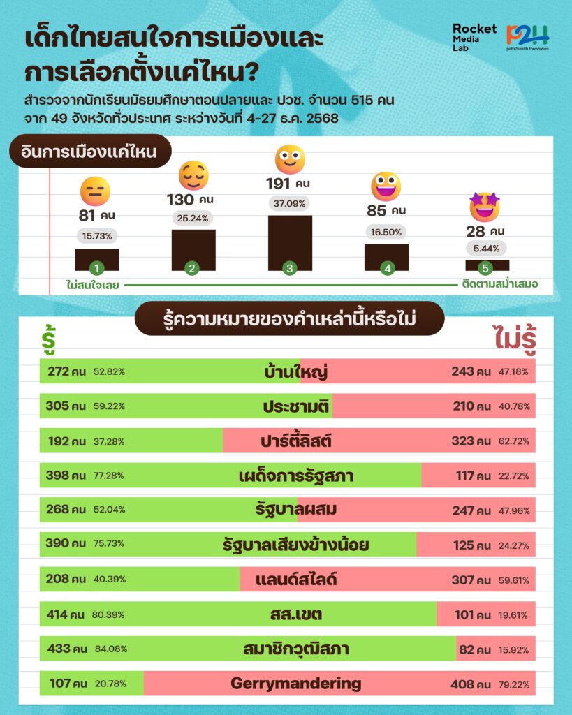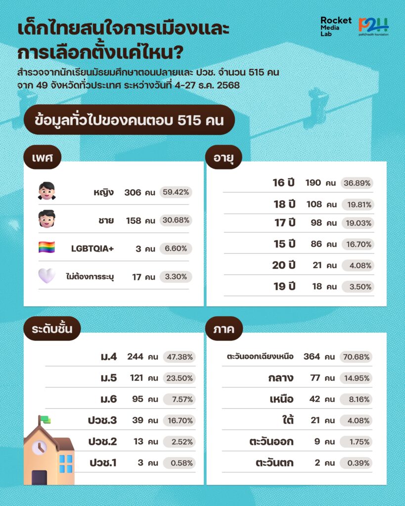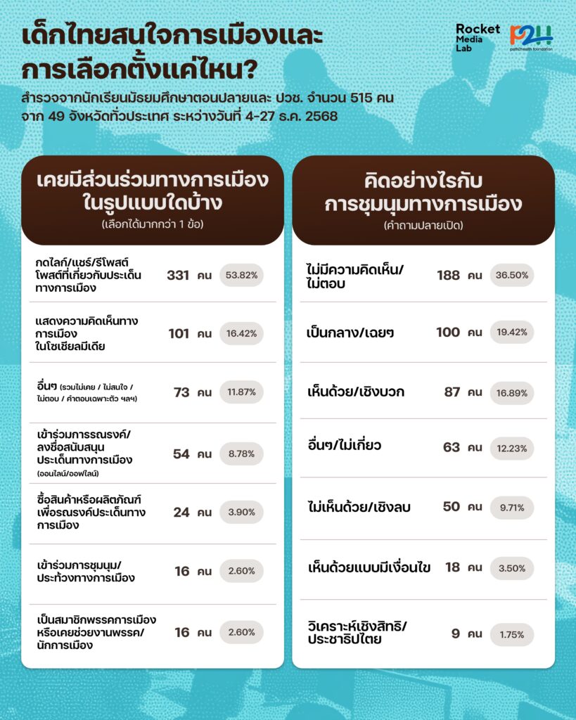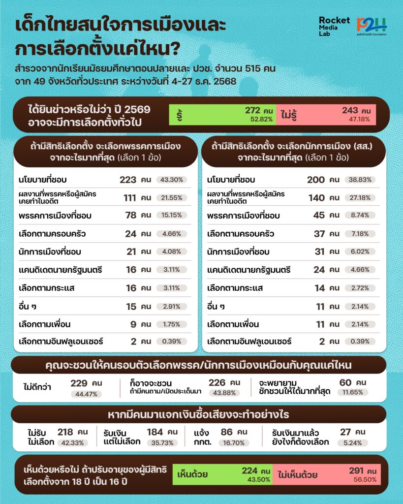 ในโอกาสวันเด็กแห่งชาติ ซึ่งตรงกับเสาร์ที่ 2 ของทุกปี ร็อกเกต มีเดีย แล็บ ร่วมกับ มูลนิธิแพธทูเฮลท์ (p2h) และเครือข่ายเยาวชน Feel Good เพื่อสำรวจทัศนคติเกี่ยวกับการเมืองและการเลือกตั้งของกลุ่มนักเรียนมัธยมศึกษาตอนปลาย (ม.4-6) และ ปวช. ระหว่าง 4-27 ธ.ค. 2568 ผลการสำรวจมีดังนี้