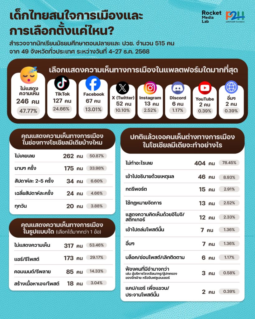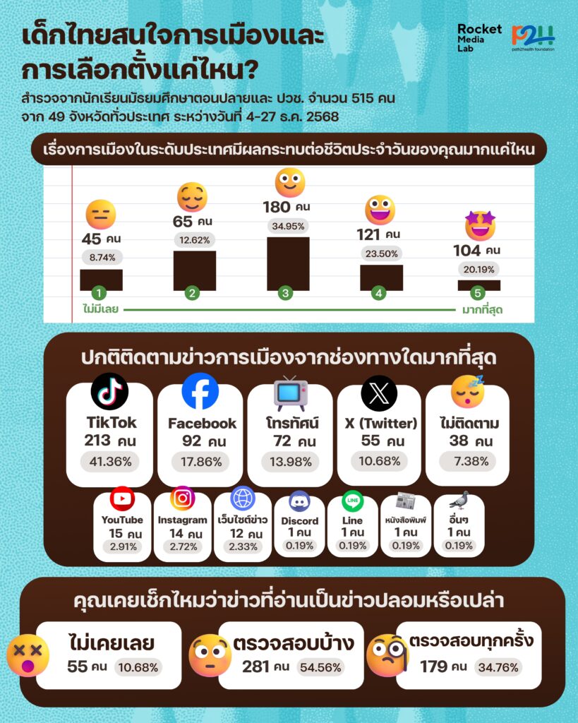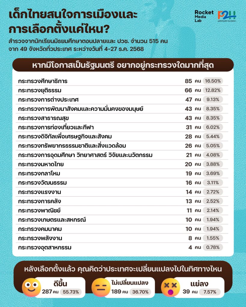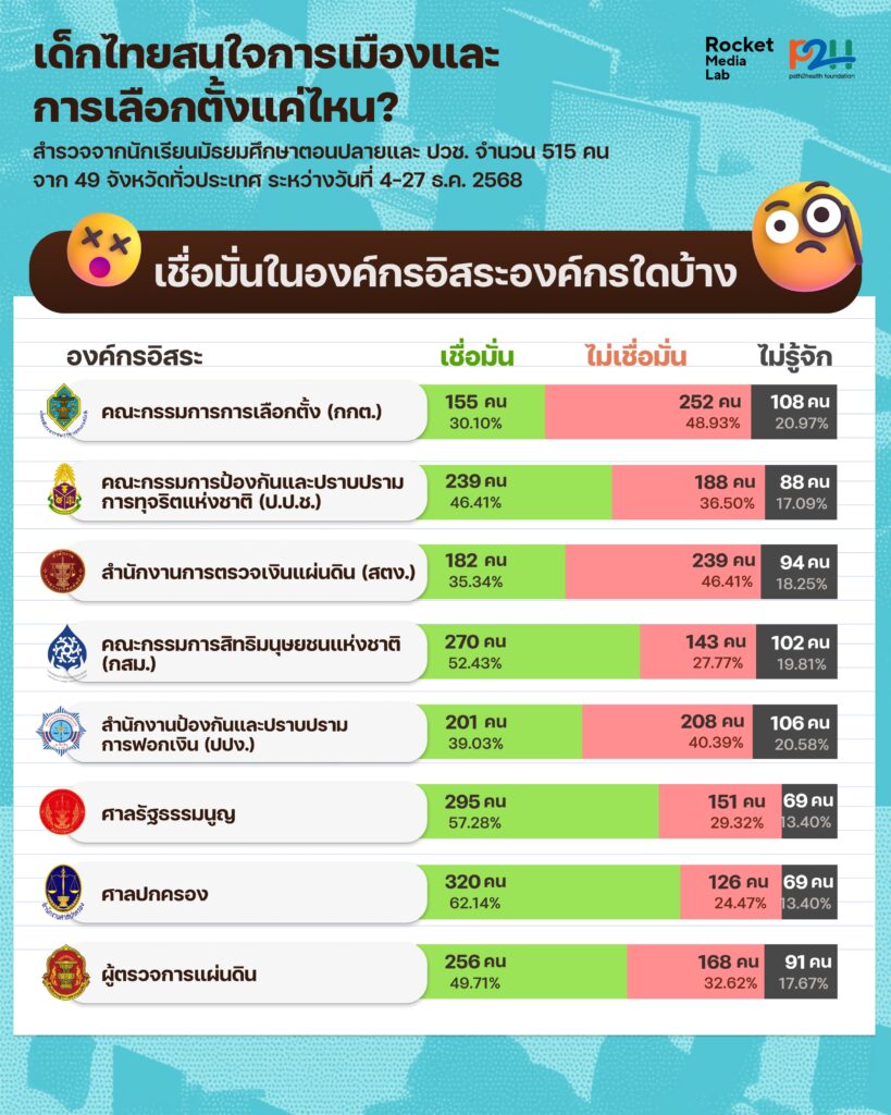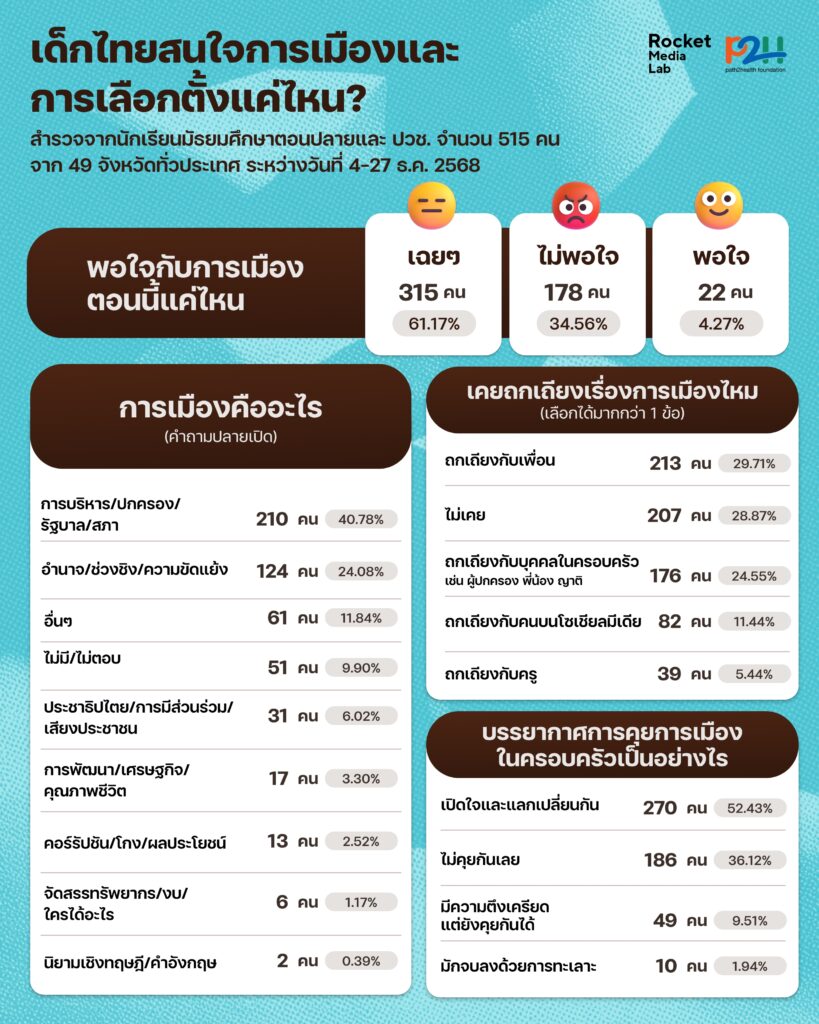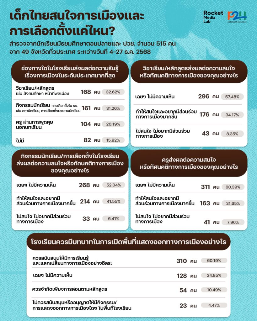 ในโอกาสวันเด็กแห่งชาติ ซึ่งตรงกับเสาร์ที่ 2 ของทุกปี ร็อกเกต มีเดีย แล็บ ร่วมกับ มูลนิธิแพธทูเฮลท์ (p2h) และเครือข่ายเยาวชน Feel Good เพื่อสำรวจทัศนคติเกี่ยวกับการเมืองและการเลือกตั้งของกลุ่มนักเรียนมัธยมศึกษาตอนปลาย (ม.4-6) และ ปวช. ระหว่าง 4-27 ธ.ค. 2568 ผลการสำรวจมีดังนี้