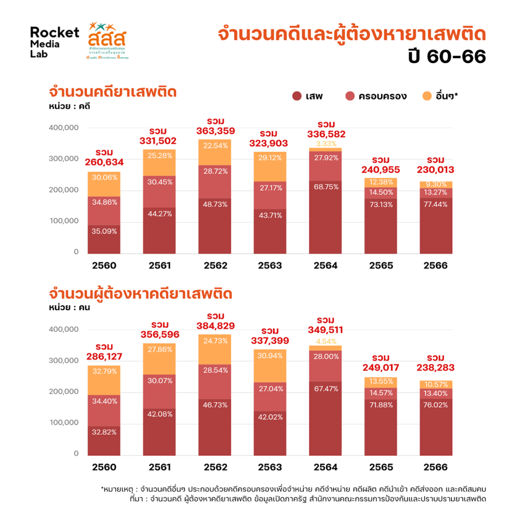 หากพิจารณาจำนวนคดียาเสพติดในช่วงหลายปีที่ผ่านมา โดยใช้ข้อมูลจากข้อมูลเปิดภาครัฐ สำนักงานคณะกรรมการป้องกันและปราบปรามยาเสพติด (ป.ป.ส.) ในปี 2560-2566 จะพบว่า แม้ในช่วงปี 2565-2566 จำนวนคดียาเสพติดจะลดลง แต่สิ่งที่เห็นได้ชัดเจนก็คือ จำนวนคดียาเสพติดที่เกิดจากการเสพนั้นเพิ่มมากขึ้น โดยเมื่อพิจารณาข้อมูลในปี 2560 จะพบว่า ประเภทของคดียาเสพติด ไม่ว่าจะเป็นการครอบครอง เสพ และอื่นๆ นั้นมีจำนวนใกล้เคียงกัน และคดียาเสพติดจากการครอบครองนั้นมีจำนวนมากที่สุด แต่หลังจากนั้นเป็นต้นมา คดียาเสพติดที่เกิดจากการเสพยามีจำนวนสูงขึ้นเรื่อยๆ จนกระทั่งในปี 2566 ที่สูงถึง 77.44% เมื่อเทียบกับคดีครอบครองและอื่นๆ