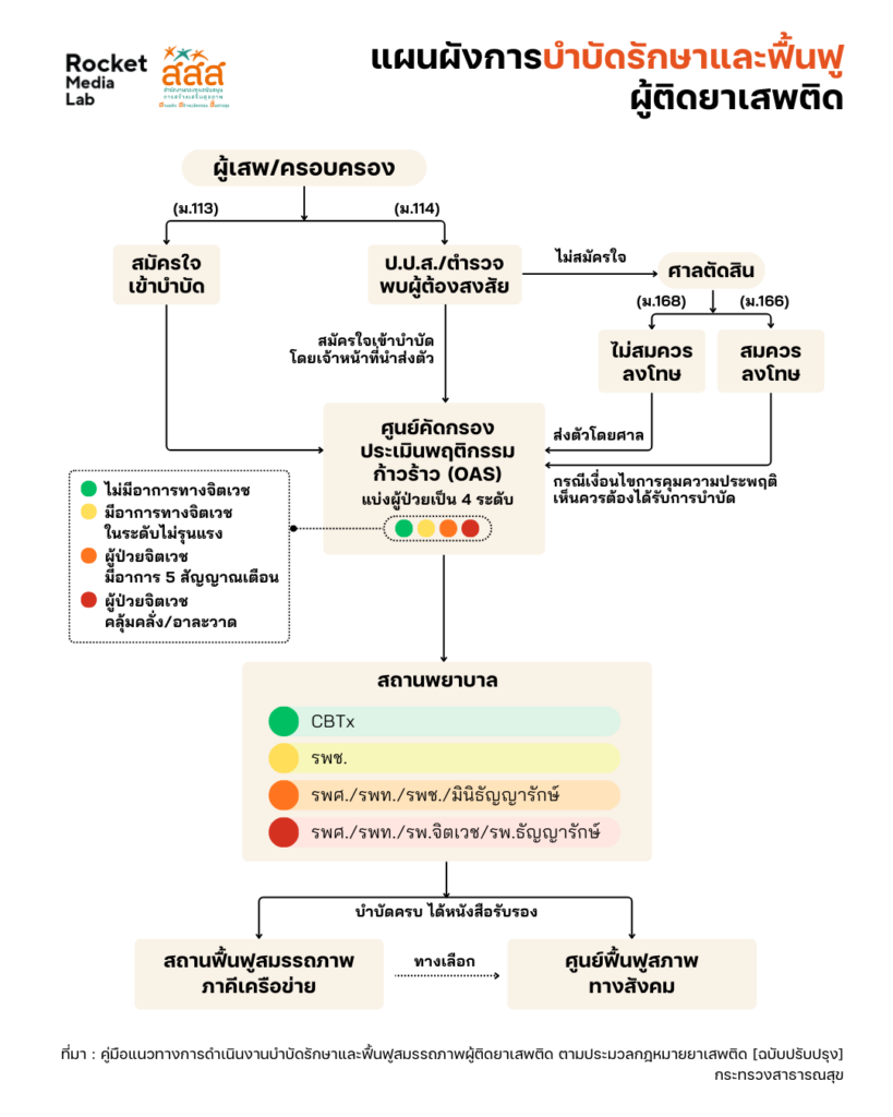 หลังการคัดกรองและแบ่งกลุ่มผู้ป่วยยาเสพติดแล้ว จะดำเนินการส่งผู้ป่วยเข้ารับการบำบัดรักษาภายใต้กระบวนการ 2 รูปแบบ ได้แก่ การบำบัดรักษาทางการแพทย์ (Medical treatment) และการบำบัดฟื้นฟูทางสังคม (Social treatment) ในการบำบัดรักษาจะแบ่งผู้ป่วยออกเป็น 4 กลุ่มตามการประเมิน OAS ได้แก่