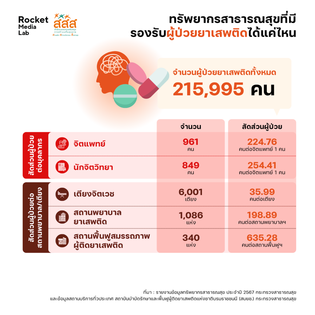 เมื่อพิจารณาข้อมูลทรัพยากรสาธารณสุข จากรายงานข้อมูลทรัพยากรสาธารณสุข ประจำปี 2567 เพื่อสำรวจจำนวนจิตแพทย์ และนักจิตวิทยา และจำนวนเตียงจิตเวช จากระบบคลังข้อมูลด้านการแพทย์และสุขภาพ (HDC) กระทรวงสาธารณสุข พบว่าประเทศไทยมีจำนวนจิตแพทย์ 961 คน คิดเป็นสัดส่วนผู้ป่วยยาเสพติดต่อจิตแพทย์ 224.76 คนต่อจิตแพทย์ 1 คน มีนักจิตวิทยา 849 คน คิดเป็นสัดส่วนผู้ป่วยยาเสพติดต่อนักจิตวิทยา 254.41 คนต่อนักจิตวิทยา 1 คน และเตียงจิตเวช 6,001 เตียง คิดเป็นสัดส่วนผู้ป่วยยาเสพติดต่อเตียงจิตเวช 35.99 คนต่อเตียง นอกจากนี้ยังพบว่าในจำนวนจิตแพทย์ดังกล่าว มีแพทย์เฉพาะทางสาขาจิตเวชศาสตร์การเสพติด (Addiction Psychiatry) เพียง 3 คนเท่านั้น โดยอยู่ในพื้นที่กรุงเทพฯ 2 คน และเชียงใหม่ 1 คน