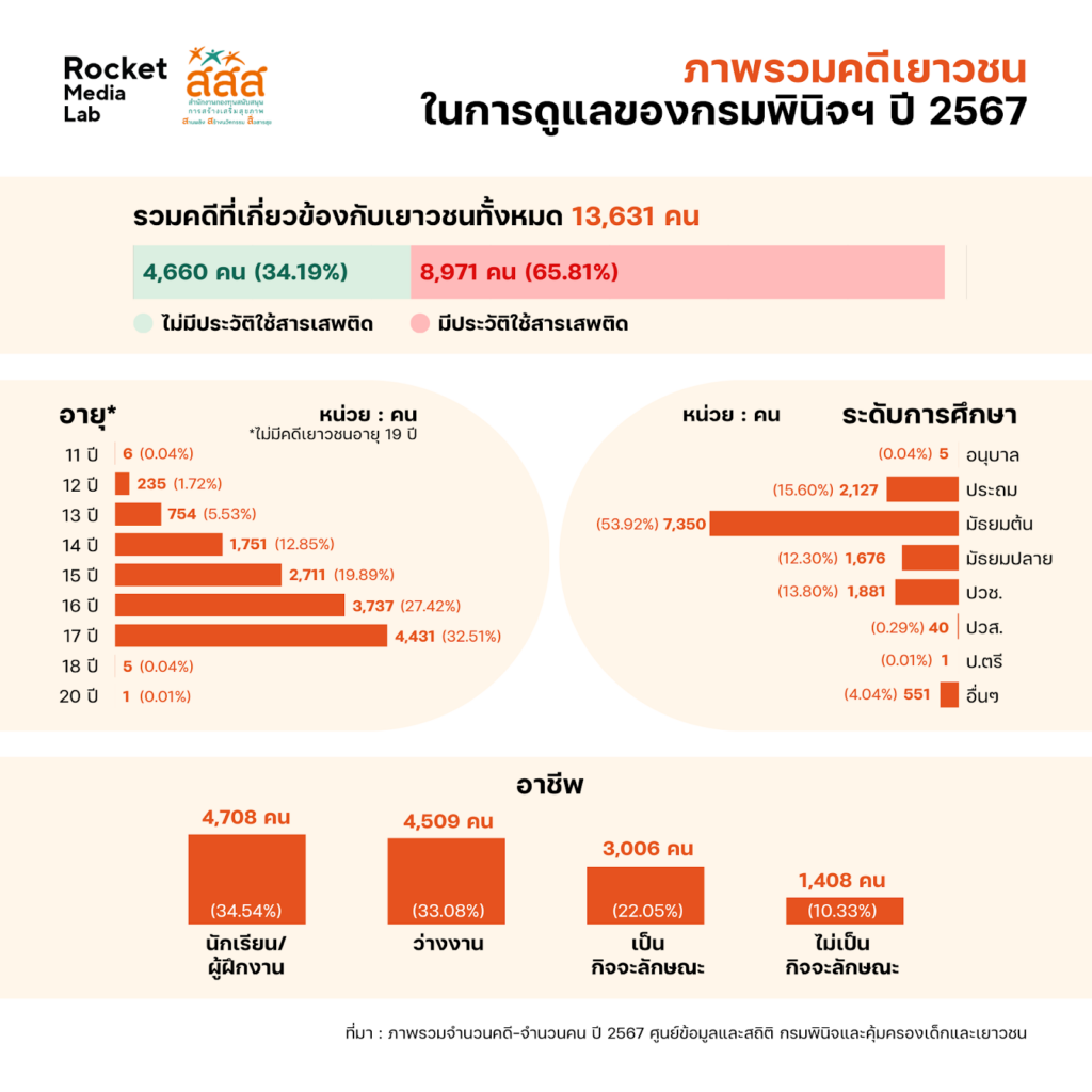 - ปี 2567 มีเยาวชนที่ถูกดำเนินคดีอาญารวม 13,631 คน โดยที่มีประวัติเคยใช้ยาเสพติด 8,971 คน คิดเป็น 65.81%