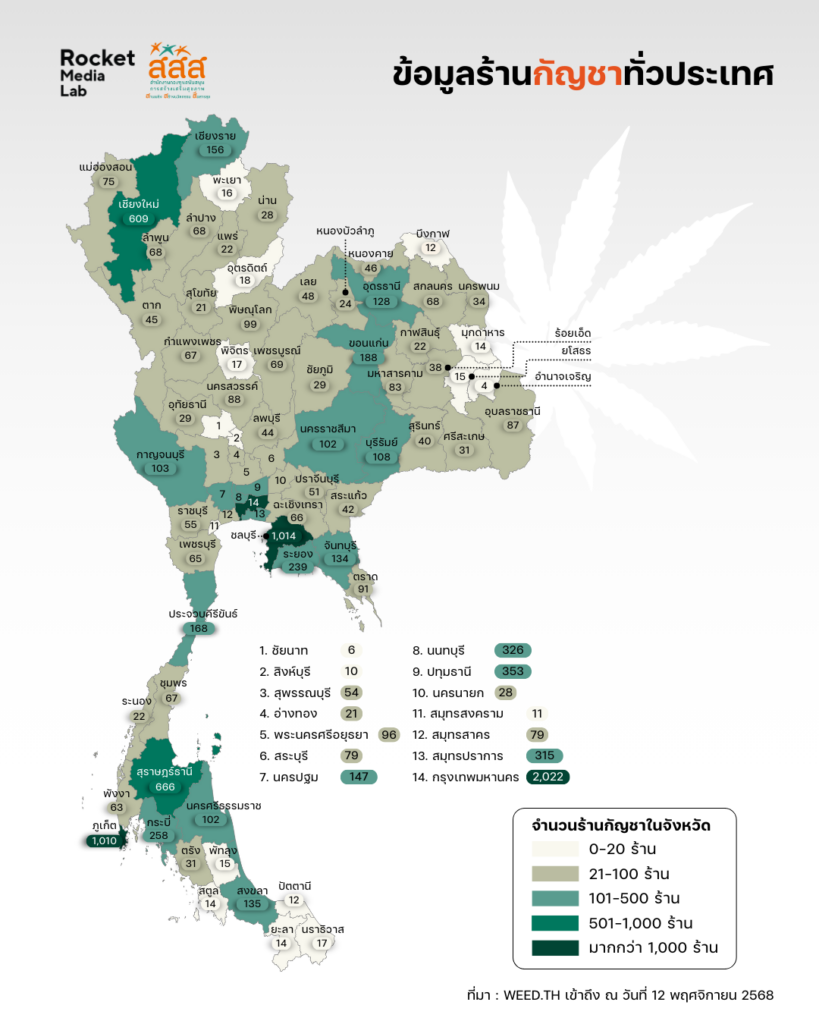 จากข้อมูลของ WEED.TH ได้รวบรวมจำนวนร้านกัญชาในไทย ณ วันที่ 12 พฤศจิกายน 2568 พบว่าประเทศไทยมีร้านกัญชาสูงถึง 10,821 ร้าน โดยจังหวัดที่มีร้านกัญชามากที่สุดคือ กรุงเทพฯ 2,022 ร้าน ตามด้วย ชลบุรี 1,014 ร้าน ภูเก็ต 1,010 ร้าน สุราษฎร์ธานี 666 ร้าน และเชียงใหม่ 609 ร้าน