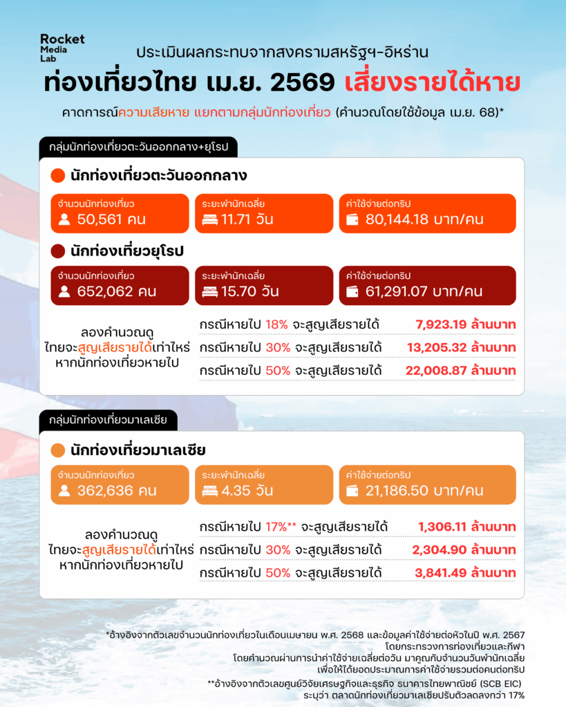 *หมายเหตุ ข้อมูลที่นำมาประกอบการวิเคราะห์นี้อ้างอิงจากตัวเลขคาดการณ์จำนวนนักท่องเที่ยวในเดือนเมษายน พ.ศ. 2568 เป็นหลัก ในส่วนของข้อมูลค่าใช้จ่ายต่อหัวนั้น เนื่องจากรายงานสถิติอย่างเป็นทางการของกระทรวงการท่องเที่ยวและกีฬาสำหรับปี 2568 ยังไม่มีการเผยแพร่ออกมา จึงเลือกใช้ข้อมูลรายได้จากการท่องเที่ยวจากนักท่องเที่ยวต่างชาติของปี 2567 มาเป็นฐานในการคำนวณ โดยคำนวณผ่านสูตรการนำค่าใช้จ่ายเฉลี่ยต่อวันมาคูณกับจำนวนวันพำนักเฉลี่ย เพื่อให้ได้ยอดประมาณการค่าใช้จ่ายรวมต่อคนต่อทริป