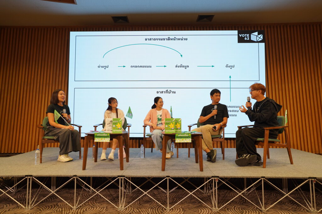 ด้านจุฑารัตน์ที่มีประสบการณ์เป็นอาสาสมัคร VOTE62 ตั้งแต่ครั้งแรก แบ่งปันประสบกรณ์ที่เธอเห็นความเปลี่ยนแปลงการเลือกตั้ง 2562 ที่คณะกรรมการประจำหน่วยเลือกตั้งส่วนใหญ่ยังไม่เข้าใจการทำงานของอาสาสมัคร ต่างจากปี 2566 ที่มีความเข้าใจมากขึ้น และหลายหน่วยมองว่า อาสาธรรมชาติเป็นส่วนหนึ่งที่ช่วยสนับสนุนการทำงานของพวกเขาให้ถูกต้อง ป้องกันความผิดพลาดที่เกิดขึ้นโดยไม่ตั้งใจได้